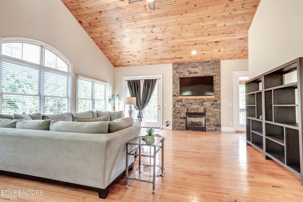 Beautiful Lakefront home on Norris Lake, in hickory Pointe. Private location with 278ft. of lake frontage. Cul- De-Sac, Low traffic area, deep water, Wide cove. Covered Dock with Jet Ski port. Lake frontage is serviced by a tram, Lake front walkway is ramped for easy access. Home features 3 bedroom,3.5 baths, cathedral ceilings, gas fireplace, 3 levels of decking,2 car garage. All appliances and furnishing convey. Close to 2 full-service marinas. Community pool, clubhouse, Fitness room, boat launch. Desirable location ,30 from Knoxville. Short term rentals OK.