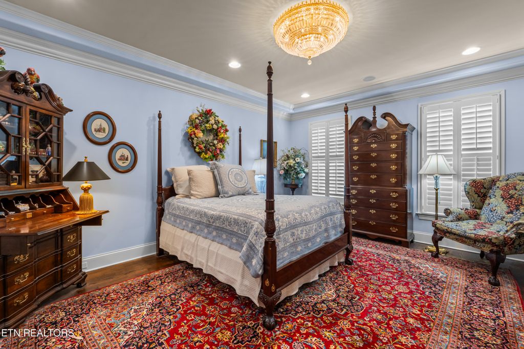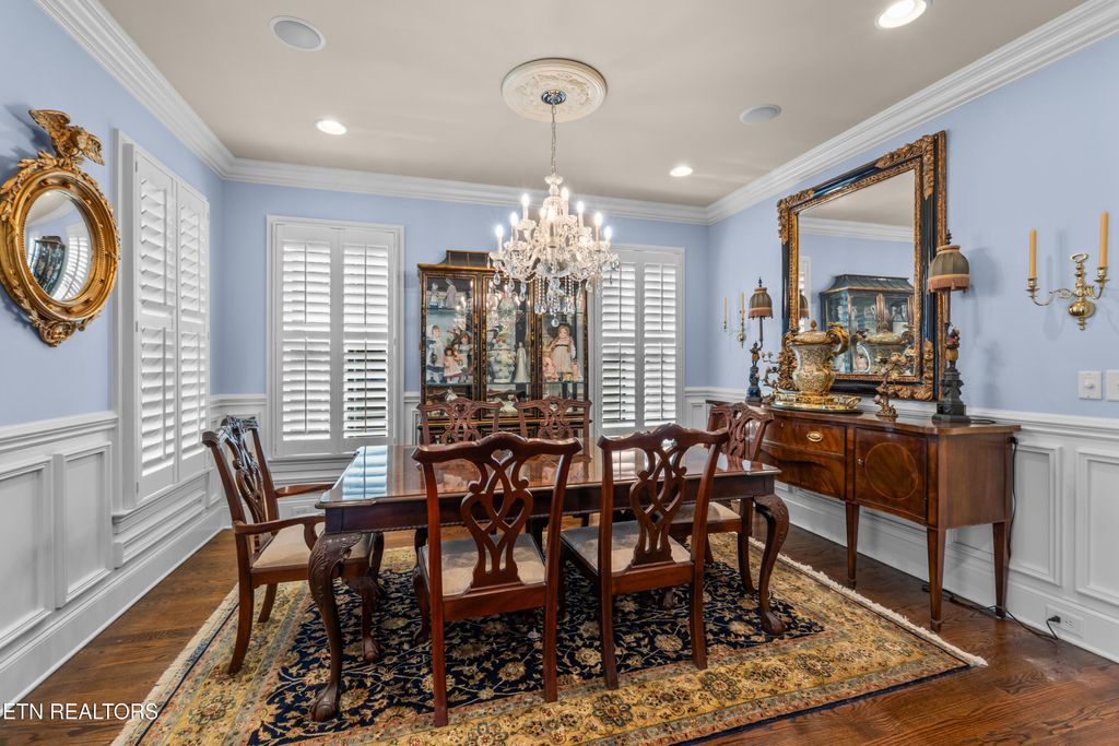 Inside, the home showcases extensive custom millwork, rich hardwood flooring throughout the main level, plantation shutters, and elegant finishes at every turn. The spacious living room features a gas fireplace, crown molding, and a striking crystal light fixture, creating a warm yet refined gathering space.