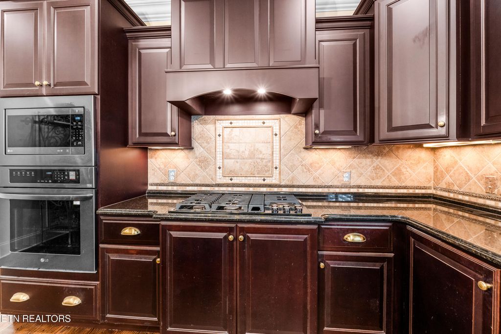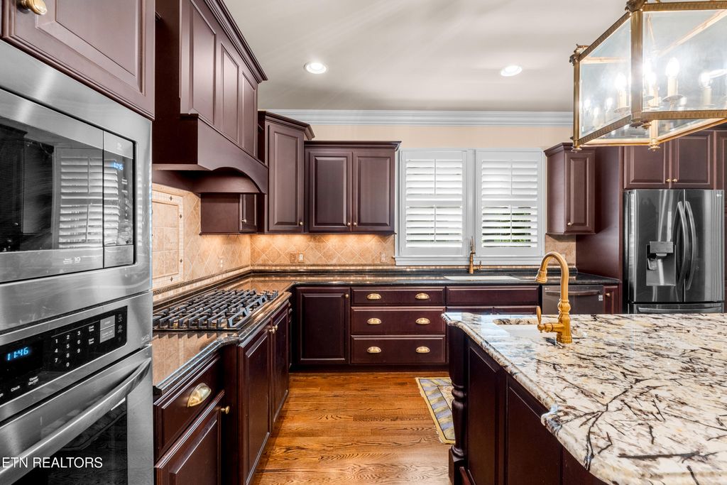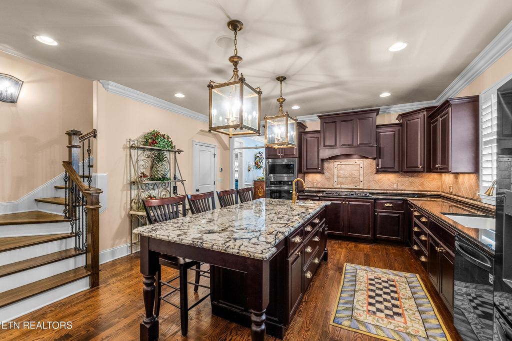 The completely updated designer kitchen is truly the heart of the home, offering custom Wildwood cabinetry, a massive 4'x8' granite island with an auxiliary veggie sink and ample seating, a tile backsplash, and soft-close drawers. High-end appliances include a gas range and built-in convection oven, while imported designer pendant lighting from Connecticut adds a distinctive upscale touch. The kitchen flows seamlessly into the dining room, highlighted by extension molding, making it ideal for entertaining.
