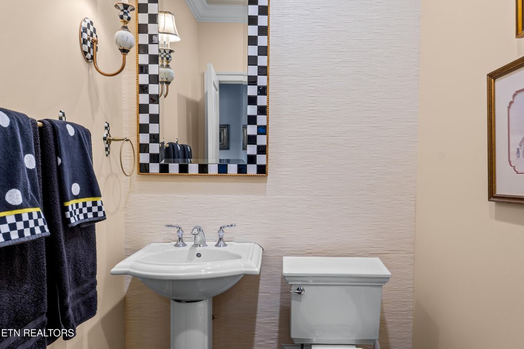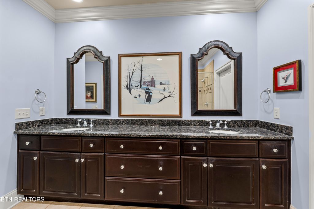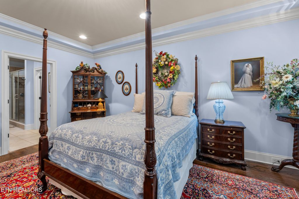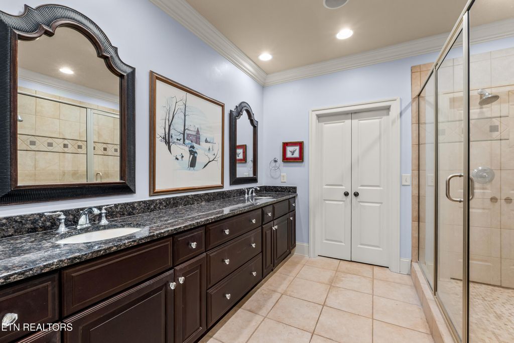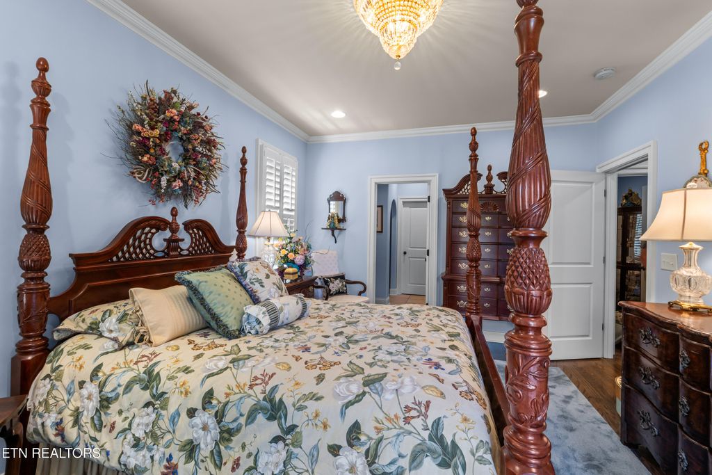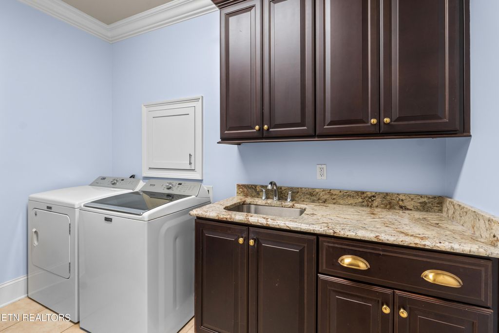 The main-level primary suite is one of the largest in the subdivision and serves as a private retreat with crown molding and a crystal light fixture. The luxurious en-suite bath features tile flooring, an oversized walk-in tile shower, a double vanity, and a generous walk-in closet with high end custom built-in shelving. The main level also includes a well-appointed laundry room with sink and cabinet storage, a mudroom, and a convenient half bath, along with a spacious two-car garage with additional storage.