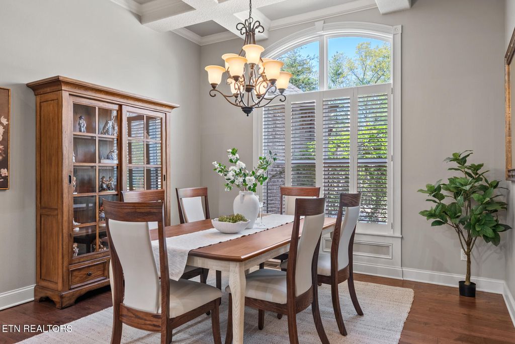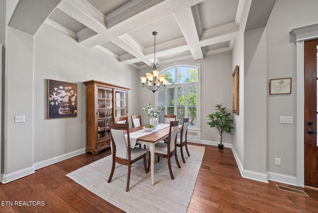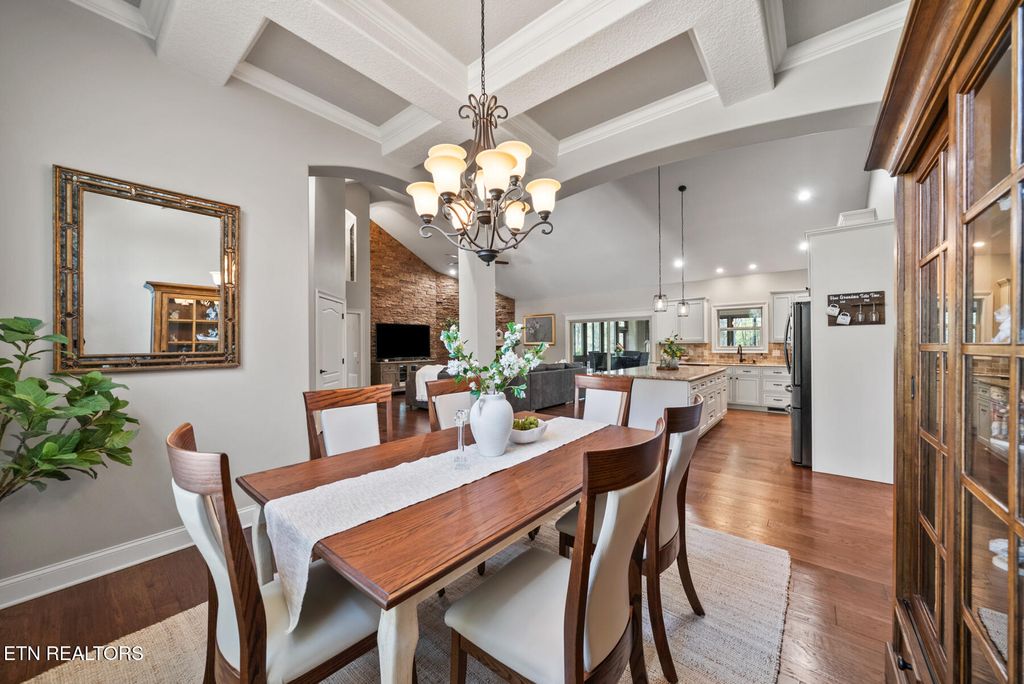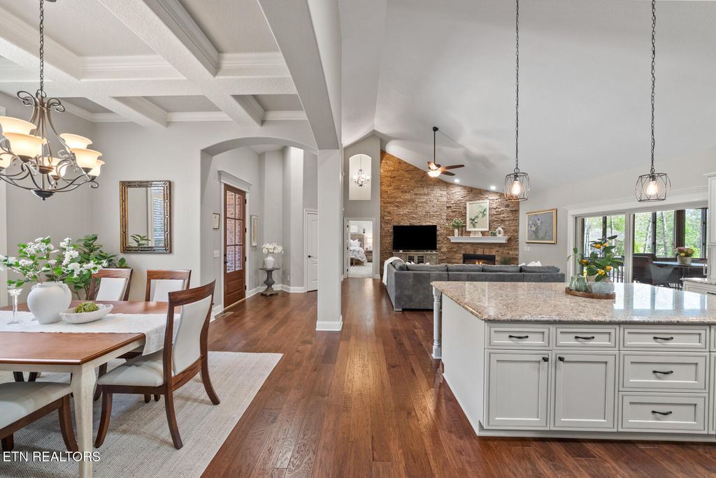 From the moment you enter, you'll appreciate the attention to detail and upscale finishes throughout. The formal dining area features stunning coffered ceilings, setting the tone for elegant entertaining. The open-concept living space is anchored by a striking stone fireplace with gas logs, creating a warm and inviting atmosphere. The kitchen is both functional and stylish, complete with ample cabinetry, granite countertops, and a large island perfect for gathering.